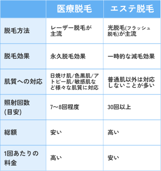 医療脱毛は、医師の管理のもと高出力の医療レーザーを使用し、毛根の組織を熱で破壊するため、結果として半永久的な脱毛効果が期待できます。一方、エステ脱毛は低出力の光を使用するため、毛の組織を破壊することはできず、効果は一時的な抑毛・減毛にとどまります。